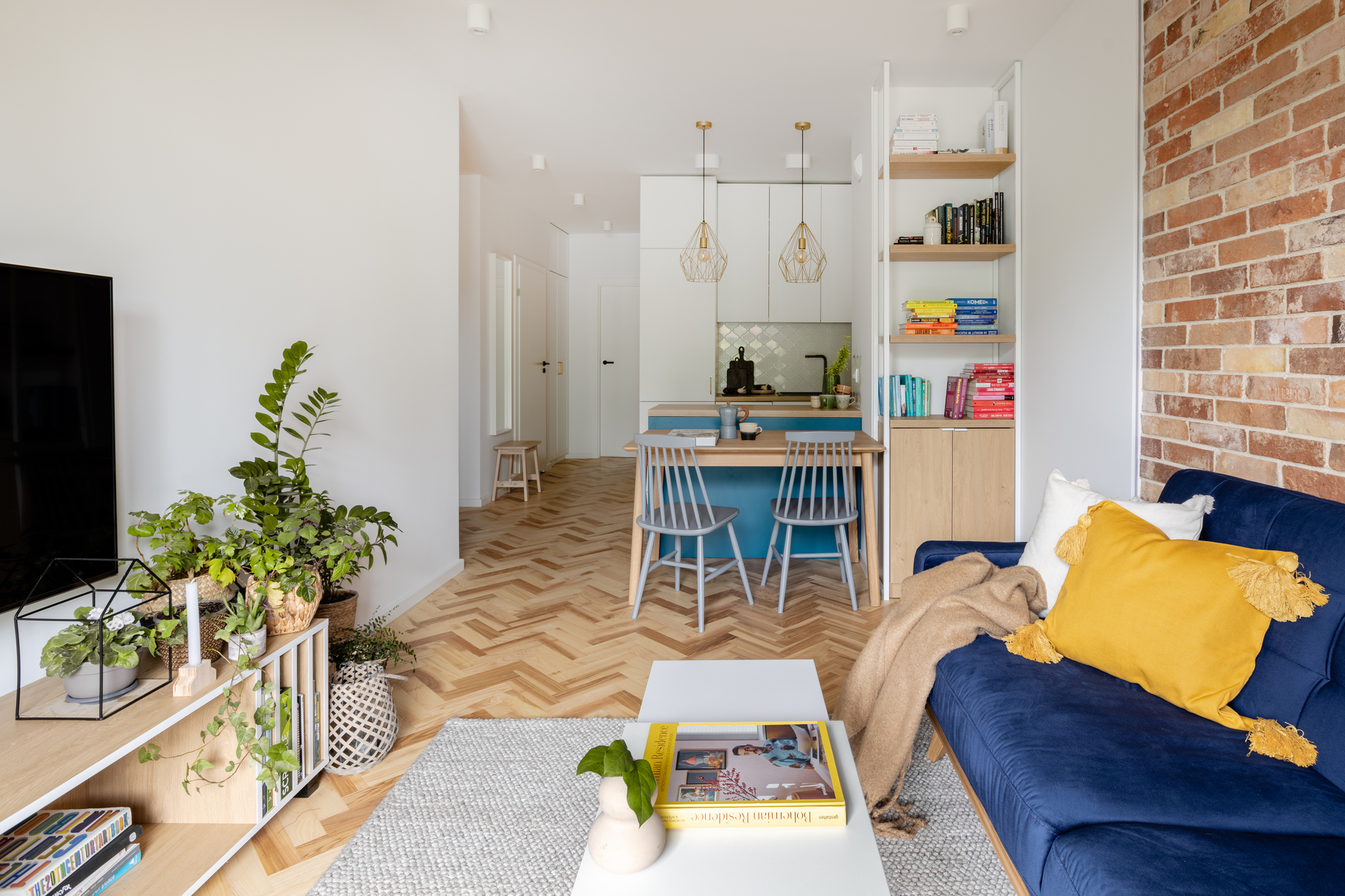 Maksymalne wykorzystanie przestrzeni, łatwe skomunikowanie i ekologiczne podejście do wykorzystywanych materiałów. Cegła, która ozdabia ścianę w pokoju dziennym to cegła rozbiórkowa. Osobistego charakteru mieszkaniu dodaje drewniana podłoga. To jesion z lasu inwestora. W sypialni zaprojektowaliśmy zabudowę wokół łóżka, urozmaicającą wnętrze i zapewniającą dodatkową przestrzeń do przechowywania. Warto zwrócić uwagę na charakterystyczną mozaikę podłogowa w strefie kuchni.
