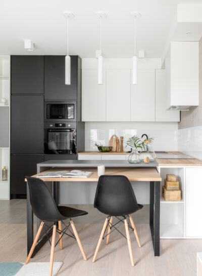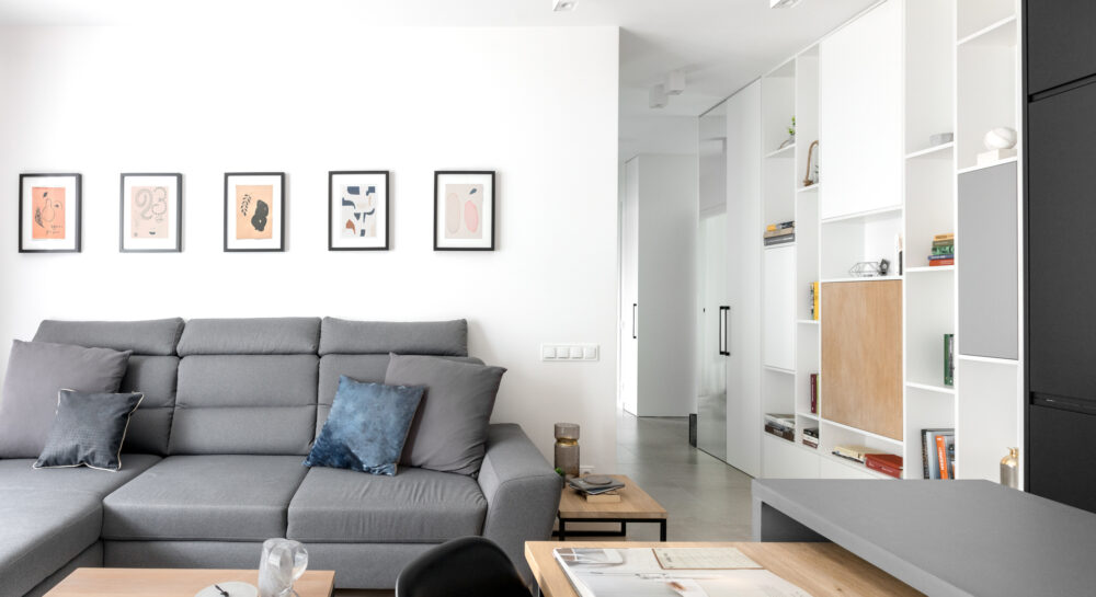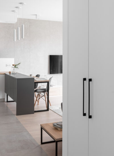 Po zmianach w układzie funkcji domownicy zyskali nową przestrzeń – dużą, wygodną łazienkę, mieszczącą wannę i prysznic i dodatkowe miejsca do przechowywania. Ciekawe rozwiązanie to również sposób lokalizacji stołu jadalnianego i wypracowane miejsce na szafę ubraniowa z siedziskiem w komunikacji. Przestrzeń dzienną urozmaica tynk dekoracyjny z charakterystycznym rysunkiem.